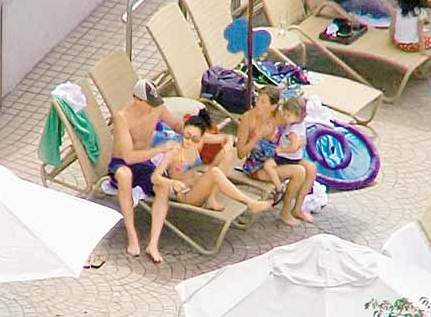 倆口子經(jīng)過一番卿卿我我,柏芝穿上T恤及長裙與男友一起到餐廳共進(jìn)午餐,約一個(gè)小時(shí)后,眾人再次返回泳池邊,其間柏芝再自行往臂上搽太陽油,并順道為同行的外籍小孩子搽油,之后便開始脫T恤,但她卻向男友撒嬌,要對(duì)方為她脫衫,男友當(dāng)然照辦,幫忙脫衣兼替她綁好背后的泳衣帶,及后柏芝帶著外籍小童到泳池游水。