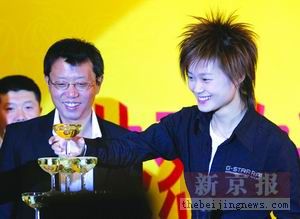 ▲李宇春(右)與太合麥田老總宋柯(左)共飲香檳,慶祝正式簽