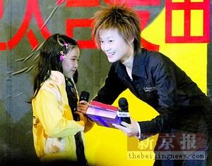 每次李宇春出席活動,主辦方總要請些“特殊玉米”前來捧場,這次也不例外,當主持人說出“這位上海遠道而來的玉米是……”不少人以為是在超女總決賽中有著“出色表現(xiàn)”的夏奶奶,不料出場的卻是位8歲的小玉米。披著長發(fā)的小姑娘穿著黃色的玉米裝,主持人和李宇春看著如此可愛的小姑娘喜笑顏開,更希望這位小玉米能發(fā)揚“小鬼當家”精神,用童言無忌將熱鬧的現(xiàn)場氣氛再創(chuàng)高潮。