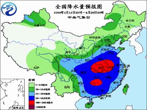 全國(guó)降水量預(yù)報(bào)圖(2009年4月16日20時(shí)~20日20時(shí))