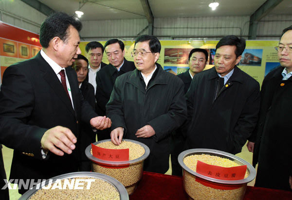 胡錦濤在三河匯福糧油集團有限公司了解生產經營情況。新華社發(fā)