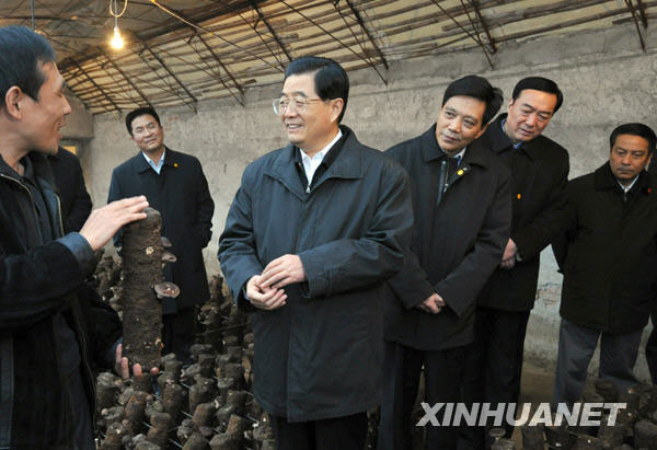 胡錦濤在三河市李旗莊鎮(zhèn)李旗莊村香菇大棚里,了解香菇種植專業(yè)合作社帶動農民增收情況。記者李學仁攝