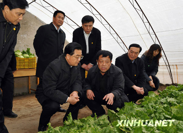 胡錦濤在三河市李旗莊鎮(zhèn)李旗莊村生菜大棚了解冬季農業(yè)生產情況。新華社記者李學仁攝