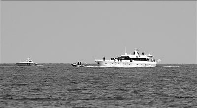 一艘救援船只(右)被押往阿什杜德港口。新華社發(fā)