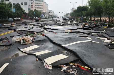 6月21日早上,江西余江縣城洪水退去,城區(qū)路面被洪水泡過(guò)后變成碎片。