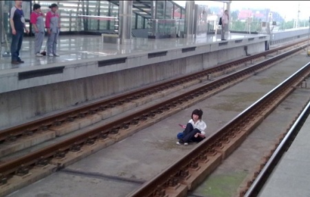 90后女孩坐地鐵軌道內(nèi)臥軌 周圍人很淡定(圖)
