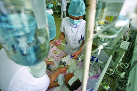 在兒童醫(yī)院的重癥監(jiān)護(hù)室,護(hù)士正在照顧患病的孩子。記者 楊寧 攝