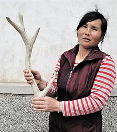 ????昨天一大早,記者趕到相先生家里,相先生從柜子里掏出一個(gè)木盒子,他將盒子打開,然后揭開里三層外三層的包裹布,小心翼翼地將一支鹿茸取了出來,記者看到,這支鹿茸呈灰白色,長(zhǎng)約60厘米,直徑3厘米,底部的鹿角盤直徑約5厘米,分4個(gè)叉,頂部?jī)刹嫒绷艘恍“?,鹿茸外表布滿了突起的斑點(diǎn)和豎的條紋。記者用手掂量了一下,整支鹿茸重量約3斤左右。