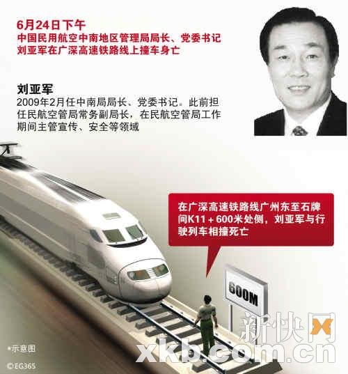 ????據(jù)一名知情人士透露,劉亞軍于6月24日下午在廣深高速鐵路線的廣州東至石牌區(qū)間K11+600米處與一輛行駛的列車發(fā)生相撞,當(dāng)場(chǎng)身亡。接到群眾報(bào)警后,廣鐵公安部門立即派出民警前往現(xiàn)場(chǎng)勘查,調(diào)取現(xiàn)場(chǎng)附近的監(jiān)控探頭錄像查看,同時(shí),對(duì)死者身份進(jìn)行核查工作。經(jīng)過(guò)核查,證實(shí)死者為中國(guó)民航局中南局局長(zhǎng)、黨委書記劉亞軍。