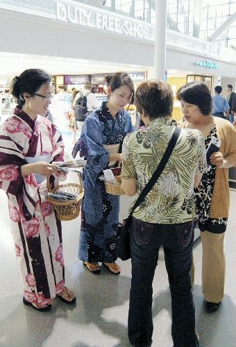 ????7月1日,日本大阪關(guān)西機(jī)場出現(xiàn)了一群身著傳統(tǒng)日本浴衣的機(jī)場地勤空姐兒向中國游客們分發(fā)紀(jì)念品的身姿。