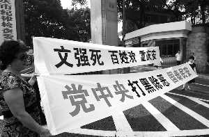 7月7日,幾名市民在中共重慶市紀(jì)委門(mén)前拉起橫幅,慶賀文強(qiáng)被執(zhí)行死刑