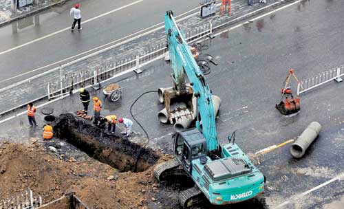 ????截至發(fā)稿時(shí),中鐵六局的工作人員已經(jīng)用無(wú)機(jī)料將大坑填充了一大部分,保證路面沒有出現(xiàn)“陷阱”。(實(shí)習(xí)生 王妍)