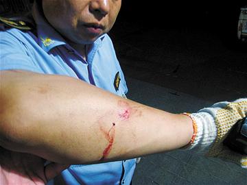 ????“我們先暫扣,明天你可以到中隊去解決。”執(zhí)法人員一邊解釋,一邊阻止中年婦女。而中年婦女突然一口咬住一名執(zhí)法人員的手臂,等她松口時,執(zhí)法人員手臂上已經(jīng)開始流血。