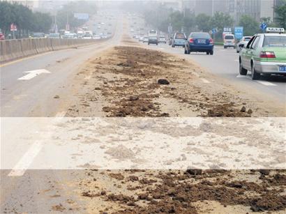 ????記者停車上前看到,福州北路南向北車道上撒落著大量的土石方,這些仍然有些濕潤的沙土中混雜了很多大塊的石頭,凌晨時分福州北路過往車輛車速很快,經(jīng)常有汽車闖過示警車輛,沖進沙石陣中,現(xiàn)場不斷響起尖銳的急剎車聲?!斑@次撒漏的土石方量特別大,從櫻花小鎮(zhèn)附近一直綿延到萊鋼立交橋,距離大概有2公里左右?!睆谋泵骜倎淼某鲎廛囁緳C稱。