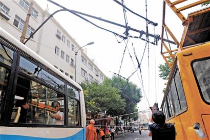 ????電車公司的搶修人員趕到現(xiàn)場(chǎng),他們將一輛帶有升降設(shè)備的工程車停在電車線支架下方,用升降設(shè)備將支架托起來,一輛2路電車慢慢從總站發(fā)出,行駛至障礙處時(shí),工作人員先扯住兩條“辮子”,電車司機(jī)立即加足馬力往前沖,工作人員瞬間將“辮子”拉脫電車線,等電車根據(jù)慣性沖出障礙處后,他們?cè)賹ⅰ稗p子”重新接到電車線上,按照如此方式,一輛輛電車通過障礙處再駛出。