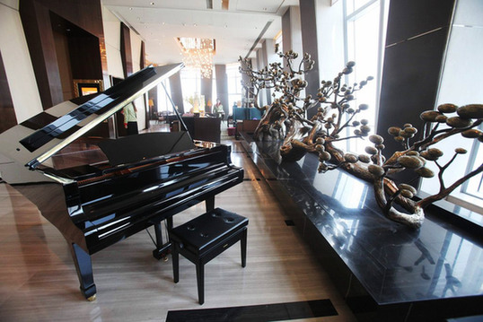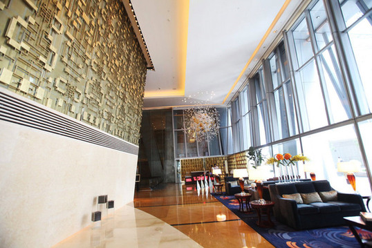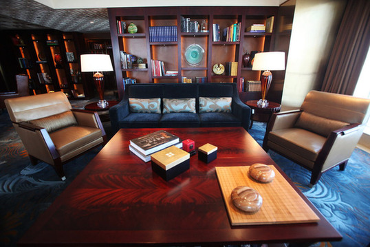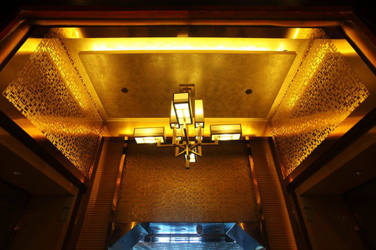 主樓大廳極盡奢華,墻體上是仿古的窗欞造型,密布的方形裝飾上貼有24K金箔,另一面玻璃隔墻上貼滿數(shù)百個(gè)打磨成圓形的石子,與大廳的金碧輝煌相映成趣,大廳四個(gè)水晶燈據(jù)稱從捷克進(jìn)口,價(jià)值不菲。