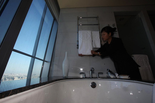 ????8月16日,北京第一高樓——高330米的國(guó)貿(mào)三期投入使用。這棟高樓除了豪華外,在美國(guó)“9.11”事件后還更改規(guī)劃,提高防飛機(jī)撞擊能力。此外,主塔樓部分樓層未來(lái)可能接待元首級(jí)人物,因此均采用防彈玻璃。