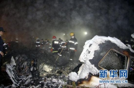 8月25日凌晨,救援人員在飛機(jī)失事現(xiàn)場搜尋幸存者。新華社發(fā)(李廣福 攝)