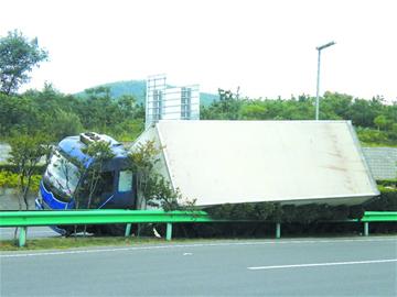 ????昨日9時許,記者途經(jīng)青銀高速時,看到在青銀高速青島方向離出站口一百米處,一輛廂式貨車砸倒了9段綠色護(hù)欄,7根藍(lán)色立柱和一排小松樹。據(jù)公路交通執(zhí)勤人員李先生和清障人員介紹,此次事故是由于車底傳動軸突然斷裂,導(dǎo)致側(cè)翻,左前輪胎附近受損較嚴(yán)重,并非人為因素造成,當(dāng)時車內(nèi)只有司機和副駕駛兩人。 “我們都好好的,沒受傷。 ”兩名當(dāng)事人告訴記者?!八緳C正在聯(lián)系客戶,因為已經(jīng)過去三個小時了,豬肉都已化凍,目前還不能確定客戶是否退貨,需要先找冰凍車將車廂內(nèi)的貨物運走,然后才能拖車。 ”李先生告訴記者。(見習(xí)記者 張譯心 攝影報道)