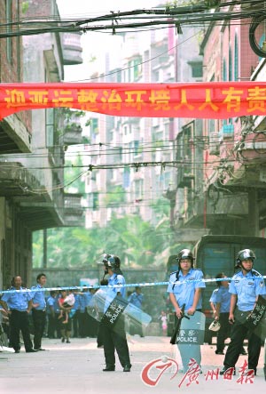 ????村子的幾個村口都被拉上封鎖線,警察、輔警、城管、保安等列隊等候命令,村中幾條主路上都安插有將近百名警力。村口守衛(wèi)封鎖線的輔警手持盾牌,一字排開,有警察手持槍支,警犬也在巷內待命。
