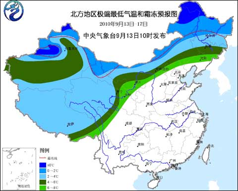 圖2 北方地區(qū)極端最低氣溫和霜凍預(yù)報圖(2010年9月13日至17日)