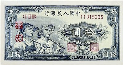 ????“當(dāng)時沒有照相機,只能請畫師畫好像再制版。”楊琦回憶說,1948年4月初,北海印鈔廠在山東五蓮縣紅凝鎮(zhèn)的一個偏僻小山村租借了兩間放農(nóng)具的房屋,開始了人民幣的美術(shù)設(shè)計。楊琦穿上工人的工作褲,戴上一頂工作帽,肩膀扛上榔頭,翟英穿上房東老鄉(xiāng)的衣服,戴上一頂用竹篾片編的涼帽,肩膀扛上一把鋤頭,同時請來一位40歲左右的李畫師為楊琦、翟英畫肖像畫,經(jīng)過6天才完成。隨后,翟英負責(zé)工農(nóng)并肩聯(lián)合主景圖設(shè)計創(chuàng)作,楊琦則負責(zé)人民幣花邊圖案的設(shè)計創(chuàng)作。又經(jīng)過兩天,兩人把主景圖及吉祥、如意圖案合并畫在樣稿上,一張10元人民幣圖案正式誕生。經(jīng)過復(fù)雜的印鈔工藝,北海印鈔廠印制的第一套人民幣終于在1948年秋完成,1948年12月1日開始發(fā)行。