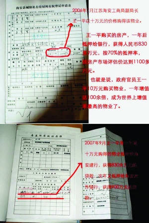 ????第一張照片是《海安縣城鎮(zhèn)私有房屋所有權(quán)登記申請(qǐng)表》,上面“權(quán)利人情況”一欄填寫的申請(qǐng)人是“王一平”,共有人是其兒子?!胺课萸闆r”一欄,顯示房屋位于海安鎮(zhèn)新寧金禧園5幢101室,“產(chǎn)價(jià)”101490元,“契稅”8158元,“房屋總層數(shù)”4,“所在層數(shù)”1,“建筑面積”391.**平方米(編者注:*處模糊)。該表登記日期是2006年8月14日。照片一旁注有的文字說(shuō)明為:“2006年7月,海安工商局副局長(zhǎng)王一平以10萬(wàn)元的價(jià)格購(gòu)得該物業(yè)。王一平購(gòu)買的房產(chǎn),一年后抵押給銀行,獲得人民幣830多萬(wàn)元,按70%的抵押率,該房產(chǎn)市場(chǎng)評(píng)估價(jià)達(dá)到1100多萬(wàn)元。也就是說(shuō),政府官員王一平10萬(wàn)元購(gòu)買物業(yè),一年增值達(dá)100余倍,成為世界上增值率最高的物業(yè)了。”