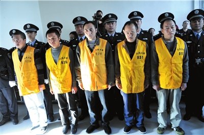 龔丞、徐磊、王凱、韓曉東、林義(前排從左至右)站在被告席上。新華社發(fā)