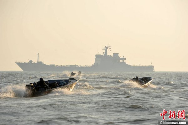 圖為“蛟龍—2010”演習海軍陸戰(zhàn)隊開乘快艇向登陸艦駛去開始浮渡裝載。中新社發(fā) 陶社蘭 攝