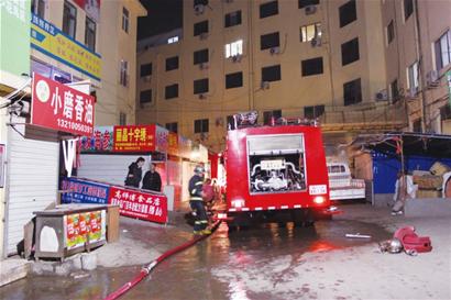 ????當記者趕到事發(fā)現(xiàn)場時,三輛消防車已經(jīng)趕到了現(xiàn)場,消防人員正在緊急滅火,攤主楊先生情緒很激動,試圖往火場里面跑,被119消防官兵阻擋?!拔依锩孢€有十五六萬元的貨物,要是燒光了我的損失就大了?!睏钕壬榫w激動地向記者介紹說。他告訴記者,他本來已經(jīng)回家了,但是晚上突然接到朋友的電話,說是從市場管理處的小樓附近著起了一把火,因為管理處旁邊都是燒紙攤和地板革等易燃物品的攤位,所以火勢蔓延很快,一連五六個攤都陷入了火海中。他跑到現(xiàn)場一看,自己的攤位也在火海中,就想進去搶貨。