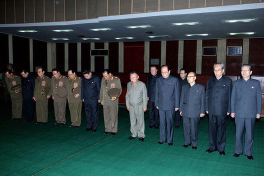 朝鮮中央通訊社11月9日提供的照片顯示,朝鮮最高領(lǐng)導(dǎo)人金正日(前右五)等黨政軍領(lǐng)導(dǎo)人吊唁朝鮮勞動(dòng)黨中央政治局常委、朝鮮國(guó)防委員會(huì)第一副委員長(zhǎng)趙明錄次帥。連日來(lái),朝鮮黨政軍領(lǐng)導(dǎo)人、人民軍官兵和民眾前往安放趙明錄遺體的勞動(dòng)黨會(huì)館吊唁。朝鮮勞動(dòng)黨中央政治局常委、國(guó)防委員會(huì)第一副委員長(zhǎng)、人民軍次帥趙明錄因長(zhǎng)期患心臟病,于當(dāng)?shù)貢r(shí)間6日10時(shí)30分去世,享年82歲。