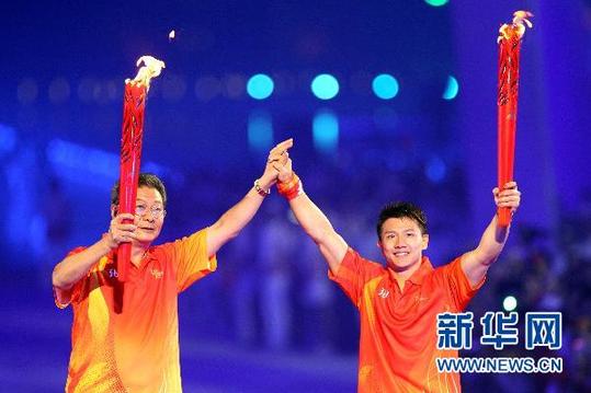 ????11月12日,第十六屆亞洲運(yùn)動(dòng)會(huì)開(kāi)幕式在廣州海心沙島舉行。這是火炬手陳一冰(右)和容志行在交接后共同展示火炬。 新華社記者凡軍攝