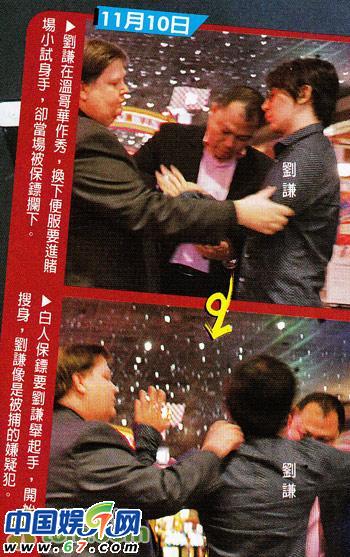 ????《劉謙變?nèi)f化之世界巡回演出》11月10日赴溫哥華列治文河石劇場(River Rock theatre)舉行兩場巡演,演出后他換上便服,欲到賭場小試手氣,卻被賭場保鏢怕他出老千強(qiáng)行搜身,逼劉謙卷起長袖才放行,一臉無奈的模樣被其他賭客拍個正著。