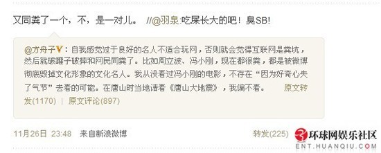 ????近日,因在微博發(fā)表“網(wǎng)絡(luò)公廁論”,周立波和網(wǎng)友開始了“群戰(zhàn)”?!按蚣俣肥俊狈街圩硬桓事浜蠹尤臊嫶蟮?“倒周團”,26日晚,方舟子將批評的聲音擴大到 “自我感覺良好的名人不適合玩網(wǎng)絡(luò)”,不光點名周立波,最近在微博上炮轟金馬獎的馮小剛也在名單之上。這次的言論,卻讓方舟子惹“火”上身,歌唱組合羽·泉直接在回復(fù)中爆粗口,稱“吃屎長大的吧!臭SB!”