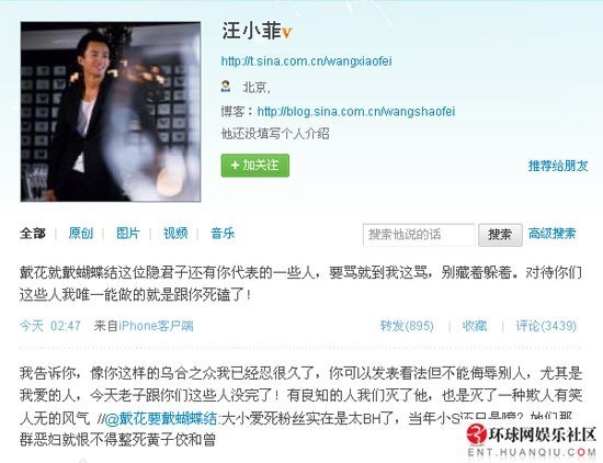 ????日前,大S與汪小菲在上海約會(huì)被拍,引來(lái)無(wú)數(shù)網(wǎng)友關(guān)注。不僅紛紛猜測(cè)約會(huì)地點(diǎn),大S頭戴藍(lán)色蝴蝶結(jié)的裝嫩造型更是慘遭網(wǎng)友拍磚。今日凌晨,汪小菲在微博對(duì)網(wǎng)友評(píng)論憤怒回?fù)?,聲稱“跟你們沒完”、“滅了他”。