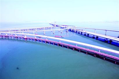 ????■上圖:鳥瞰日前貫通的我國唯一的海上立交橋——青島海灣大橋紅島立交橋。據(jù)了解,由山東高速集團(tuán)投資建設(shè)經(jīng)營的青島海灣大橋累計(jì)完成投資83.8億元,累計(jì)完成占概算投資(95.3億元)的88%。大橋下部結(jié)構(gòu)已基本完成,上部結(jié)構(gòu)完成98%。大沽河航道橋、紅島航道橋、滄口航道橋的主體工程已基本完工,橋面鋪裝施工已完成60%以上,預(yù)計(jì)到今年年底主體完工,2011年上半年通車。