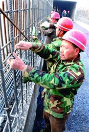 ????■下圖:昨天,青島路橋集團(tuán)的施工人員在海灣大橋紅島接線工程 (陸域段)前陽村涵洞施工工地綁扎鋼筋。為確保接線工程明年如期實(shí)現(xiàn)通車,該公司在冬季采取覆蓋、搭建溫暖棚和燃燒小鍋爐等方法趕工期、保質(zhì)量。