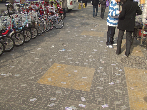 12月5日,記者在李村書院路附近看到,地上的小廣告密密麻麻,最多的地方一平米可達二十張左右。人行道、公交車站、十字路口成了小廣告的“重災(zāi)區(qū)”??瓷先シ浅T?,十分影響市容。一位過路男子表示,這種情況太影響青島的形象。