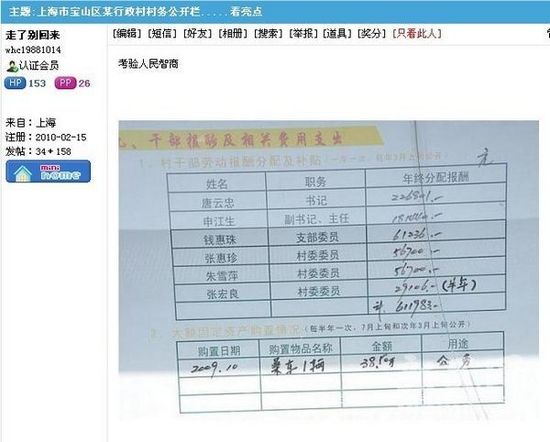 ????日前,一則名為“上海市寶山區(qū)某行政村村務(wù)公開欄”的帖子在KDS等本地論壇迅速躥紅,引發(fā)網(wǎng)友熱議的是一張攝于“干部報(bào)酬及相關(guān)費(fèi)用支出”的照片。照片中,“村干部勞動(dòng)報(bào)酬分配及補(bǔ)貼”欄內(nèi)標(biāo)注:名為“唐云忠”的書記年終分配報(bào)酬為226801元,另一名為“申江生”的副書記、主任報(bào)酬為181440元,其余4人分別為支部委員和村委委員,6名村干部的年終分配總金額超過60萬余元。