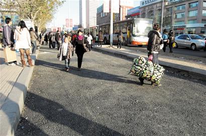 ????昨日,記者再次來(lái)到香港中路辛家莊站看到,工程有了新進(jìn)展,在原先回填的路面上做了一層簡(jiǎn)單的瀝青鋪設(shè),路面硬化不少,但由于工程仍未完全竣工,兩頭仍被護(hù)欄圍著,公交車不能通行,只好在機(jī)動(dòng)車道上緊挨著花壇停車上下客。