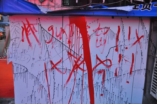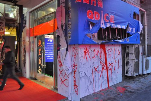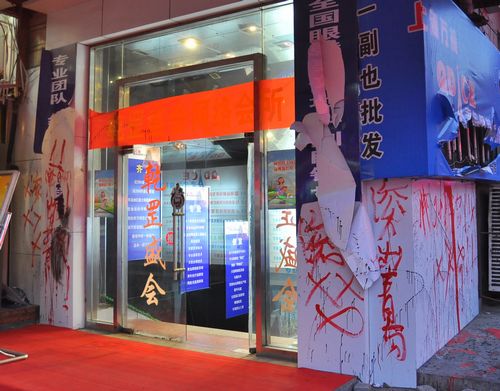 ????網(wǎng)友天下無戒在青島論壇發(fā)帖,標(biāo)題為:《gun出青島!臺(tái)東街頭驚現(xiàn)史上最文盲恐嚇信》,貼文如下:早上去上班,臺(tái)東1路單位附近,看到一家眼鏡批發(fā)城前面聚滿了人,警察都去了。這家店的老板和店員正在門口氣得蹦高——原來,這家店的燈箱和門頭被其它賣眼鏡的同行砸壞了,還被潑上了油漆。更搞笑的是他們家門上被寫上了一封很短的恐嚇標(biāo)語:gun出青島!×××××,是用紅色油漆寫的,書法水平很差,“滾”只寫了一半,好像不會(huì)寫了,就用拼音代替了。哈哈哈哈哈。笑得我肚子疼。那個(gè)老板顯然在附近住,厚衣服都沒穿就跑來了,頭發(fā)亂得像鳥窩,他鼻涕全下來了:“我就做個(gè)生意,東西賣低點(diǎn),我招誰惹誰了?!彼麄兗业牡陠T也都抓狂了。這兩天我上下班都經(jīng)過這,他們剛開業(yè)三四天,去的人挺多,早上6點(diǎn)來鐘就有老頭老奶奶排隊(duì),簡(jiǎn)直跟不要命似的。 警察進(jìn)去后,我在后面拍了幾張照片,讓大家見識(shí)一下。