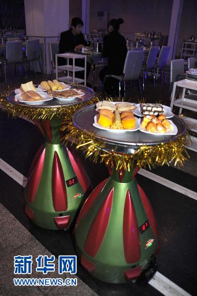 12月27日,兩個(gè)送餐機(jī)器人在餐廳服務(wù)。