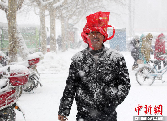 12月25日,威海文登市民在雪中前行。自24日開始,山東半島的煙臺(tái)威海地區(qū),持續(xù)降小到中雪,局部大雪,威海市氣象臺(tái)發(fā)布道路結(jié)冰黃色預(yù)警和大風(fēng)黃色預(yù)警,持續(xù)的低溫降雪對(duì)當(dāng)?shù)毓方煌ㄔ斐闪擞绊?,市民在白茫茫雪中度過圣誕節(jié)。中新社發(fā)陳宏青 攝
