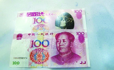昨天上午,丹陽(yáng)市民張先生忽然接到了一張小廣告,和一百元面值人民幣幾乎一模一樣,偉人頭像被一名時(shí)尚的美女模特所取代,左上角“中國(guó)人民銀行”的位置,被印成了“××發(fā)藝中心”,就連左下角該有的編號(hào)也被涂抹掉了?!叭嗣駧拧钡恼孢€印著商家的地址、電話(huà),背面則是店面的線路圖和優(yōu)惠信息。