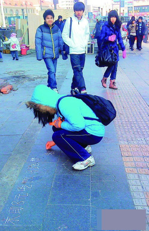 ????1月1日上午11時許,記者路過郯城路通往站前廣場的地下通道時,發(fā)現(xiàn)一名女子半蹲在地上,女子面前用粉筆寫著一行字:“求助8元吃飯,及路費。謝謝!”女子一動不動地半蹲著,使勁低著頭,頭發(fā)垂下來將整張臉擋得嚴嚴實實。女子上身穿著藍色的羽絨服,背著一個雙肩包,很多人猜測她是名學(xué)生。
