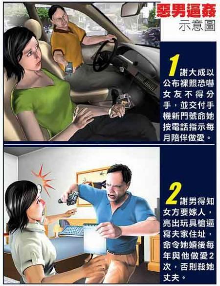 示意圖。圖片來源:臺灣媒體 ????臺灣一男子謝大成利用一張裸照,逼一名島內(nèi)的女大學生當其性奴長達10年,規(guī)定被害人每月要和他做愛一次,直到前年4月被害人打算結婚,謝還拿玩具槍恐嚇對方婚后仍須每年和他做愛兩次,否則將殺害其丈夫。臺灣“最高法院”日前維持2審判決,依強制性交等罪將這名惡狼判刑7年6個月,全案定讞。 ????法院審理期間,謝大成曾在法庭上表示,10年來2人一直維持男女朋友關系,且?;ネ娫挘潜缓θ肆硗馔到恍履杏?,自己絕沒有用裸照強逼對方發(fā)生性關系。被害人則向法官哭訴這些年過得很痛苦,性愛時間都是他(指謝)在規(guī)定,本想時間一過此事就算了結,未料謝大成逼她做性奴長達10年。前年4月,她本打算結婚,但謝大成拿玩具槍恐嚇她婚后仍須每年和其做愛兩次,否則將殺害她的丈夫。 ????臺灣“最高法院”審理后日前維持2審判決,依強制性交等罪將謝大成判刑7年6個月,全案定讞。(記者?馮存健) |