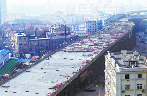 ????1月4日,快速路三期東端與膠州路接線處的橋面水泥鋪設(shè)工程正在進(jìn)行中。從高處俯視,立交橋接線處水泥已全部鋪設(shè)完畢,施工人員正準(zhǔn)備往上蓋棉被,以防凍壞橋面,等待來年氣溫回升后鋪設(shè)最后的瀝青面。