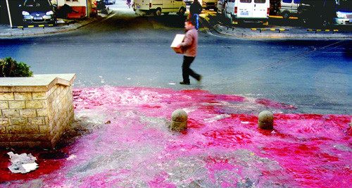 ???1月6日上午8時(shí)許,在撫順路蔬菜副食品批發(fā)市場(chǎng)南側(cè)的遼陽(yáng)西路上,一大片“血冰”占滿了人行道,場(chǎng)景讓人驚心。盡管這些血水已經(jīng)結(jié)冰,但是血腥味還是撲鼻而來(lái),行人只好被迫到車行道上行走。這些成片的血冰從何而來(lái)?