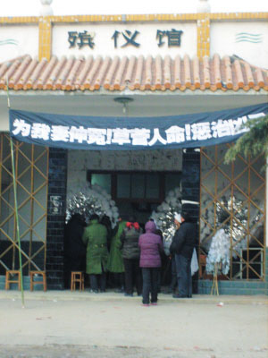 “沒有的事,我們從來就沒接受這一說法?!崩罾蛏暗囊幻従訐u頭對記者說。他指著殯儀館門口懸掛的寫有“草菅人命,懲治兇手”等黑色大字的白色橫幅介紹說:“我們在殯儀館住了三四天了,就是希望能夠有一個公道的說法,希望能夠懲治兇手,告慰死者?!?/p>