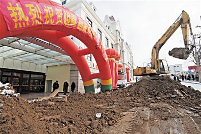 記者聞訊趕到現(xiàn)場,行駛至曲阜路和浙江路路口時看到,民警設置了警戒線封鎖了曲阜路。曲阜路北側靠近商場的路面和人行道上堆著數(shù)十堆建筑垃圾,將商場的南門和地下停車場入口堵得嚴嚴實實,一輛移動警務室也被土堆困在里面無法離開。與建筑垃圾形成鮮明對比的是商場的大門前擺放著紅色拱門,拱門上還掛著祝賀商場開業(yè)大吉的橫幅。土堆旁幾輛挖掘機同時施工,將商場大門前的土堆移到一旁。